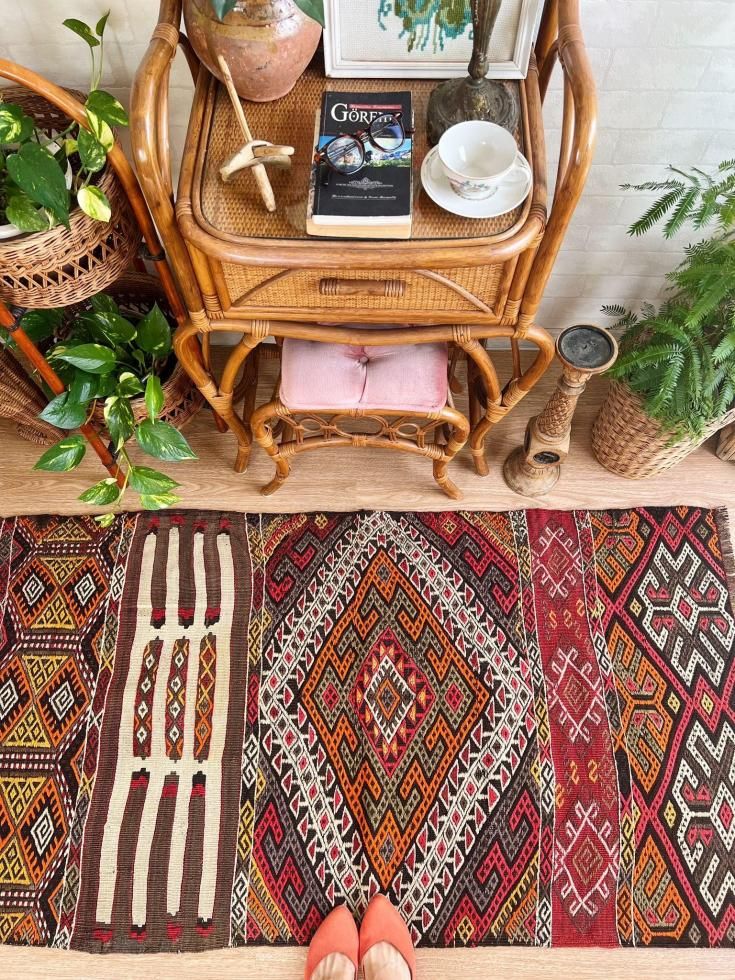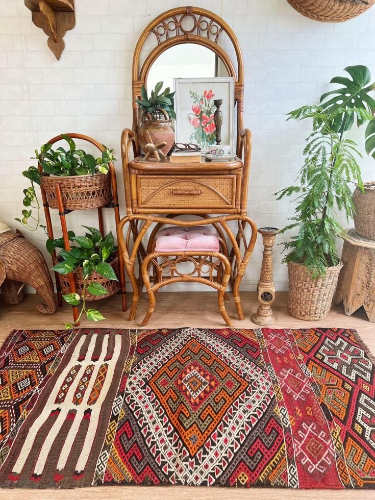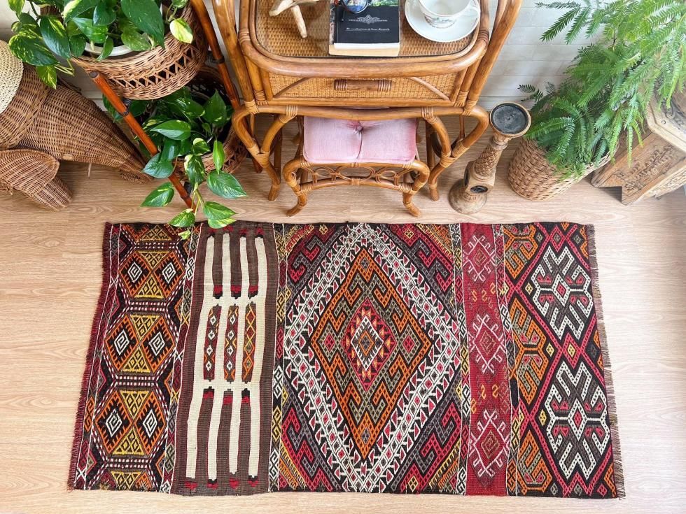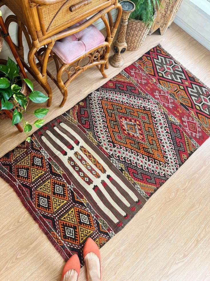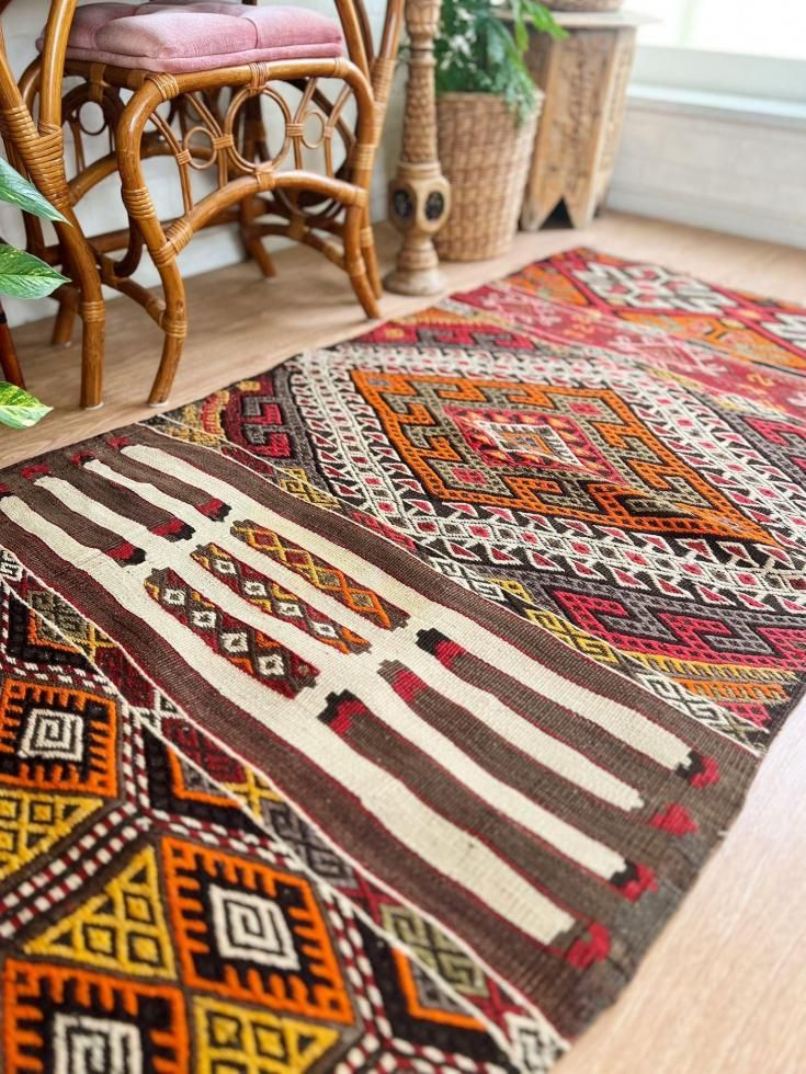 大胆なデザインのこちらのキリムは床に敷いたり壁に掛けたりなどなど様々な使い方でお楽しみいただけるとっておきの一枚。