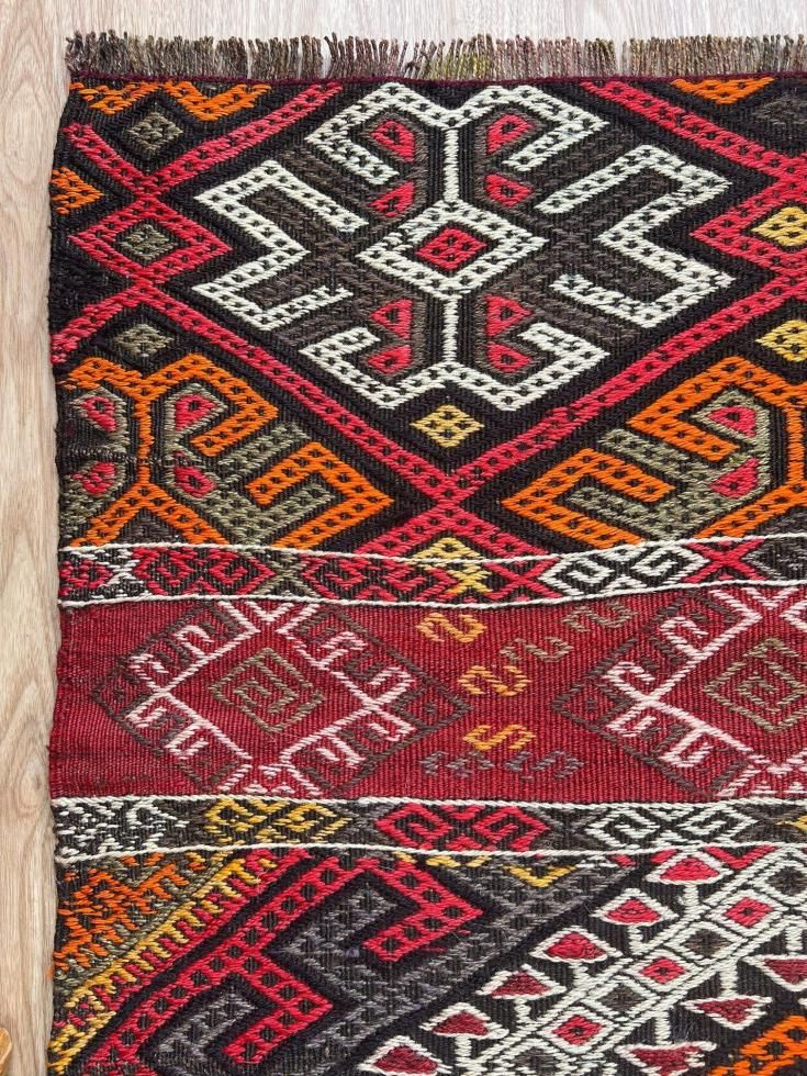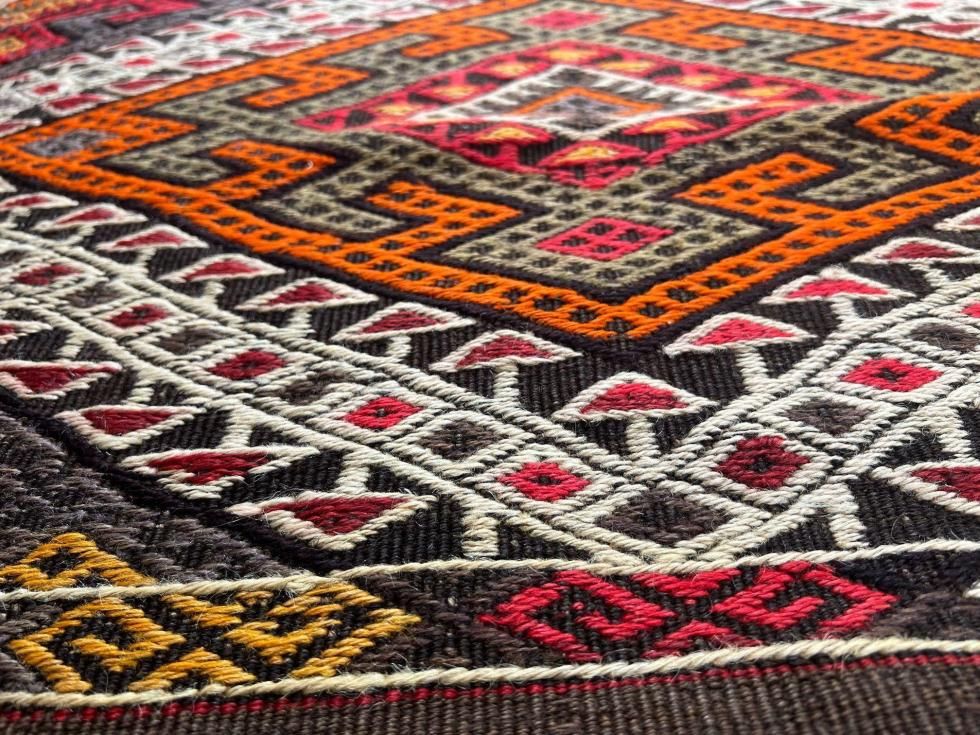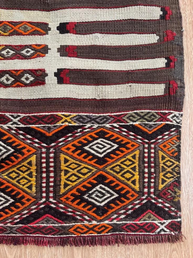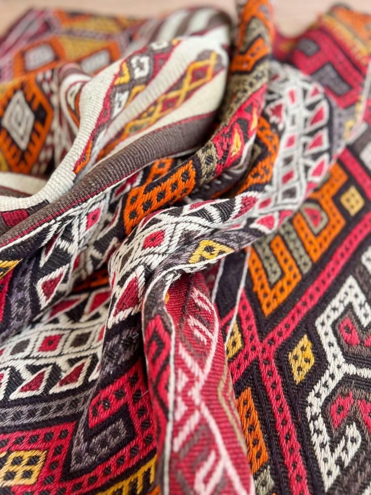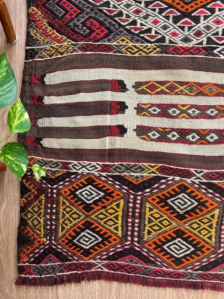 トルコの東部に暮らすクルド人の人達にとってこのような平織とジジム織を混ぜ合わせたキリムはお嫁に行く際に遊牧民の人たちが織ったものが多くあります。